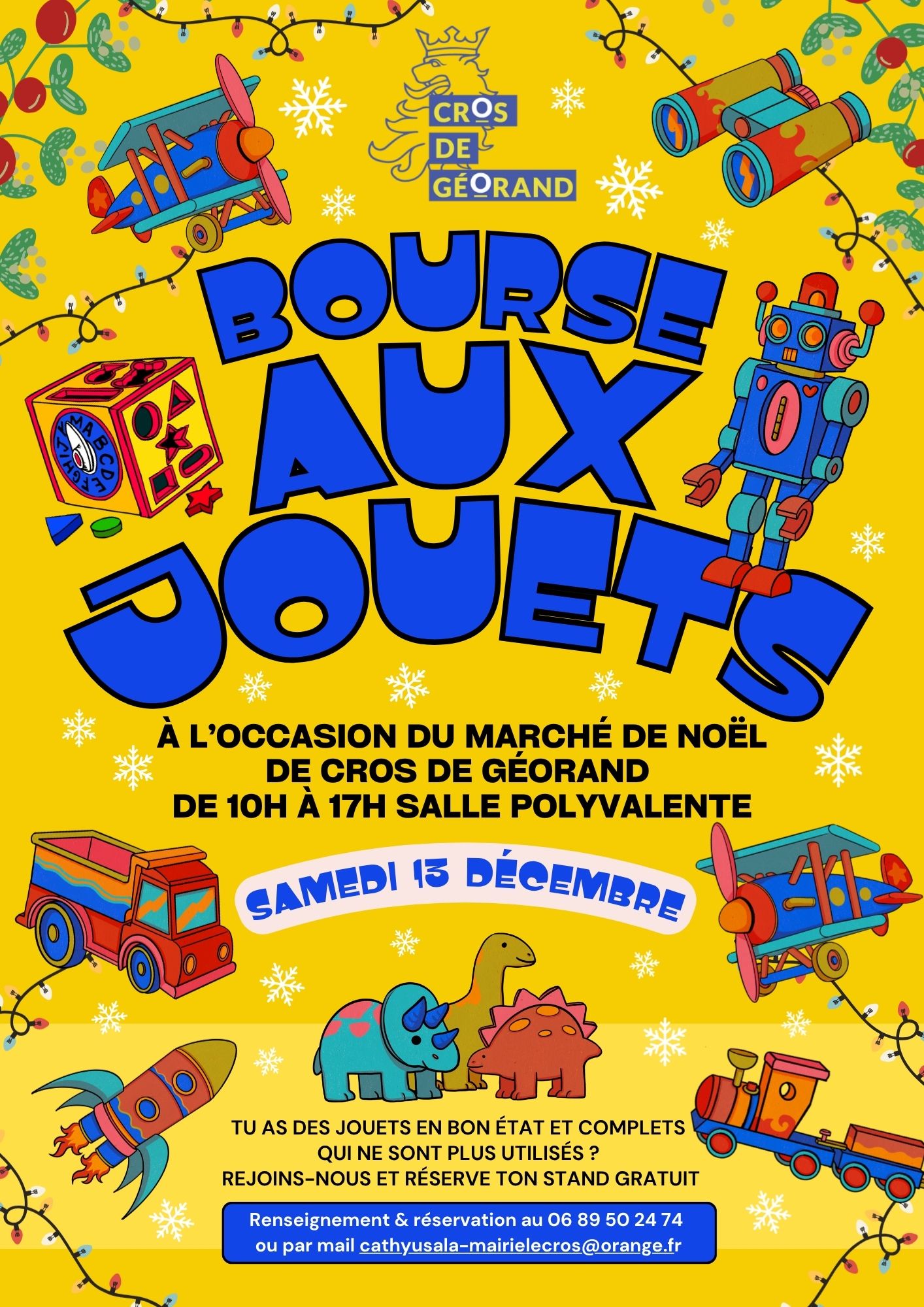Cette bourse aux jouets aura lieu un jour de fête puisqu’elle se déroule au coeur du Marché de Noël prévu le samedi 13 décembre à Cros de Géorand. Et cette invitation s’adresse directement aux enfants leur permettant de gagner quelques sous et/ou d’échanger leurs jeux.
