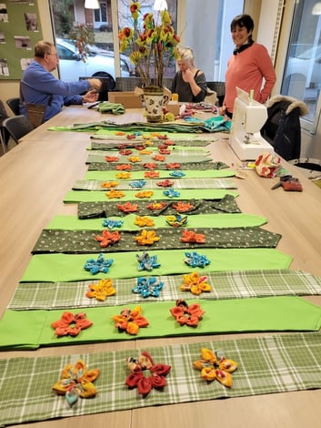 Et de couper, coudre, coller, assembler de grandes tentures florales ou de petites fleurs qui agrémenteront balcons, balustrades, buvette, etc. Dans la salle des associations, le printemps a déjà envahi l’espace ! Le plaisir de se retrouver dans la bonne humeur est perceptible et la pause tisane vient clore l’après-midi.