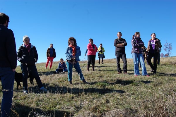 A 11h00, Manu a invité les nombreuses personnes à accompagner le troupeau. Les chèvres sont parties en tête, heureuse de rejoindre le pâturage. En haut de la colline, Manu a présenté la lande que