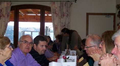 La porte du restaurant « Le Panoramic » est ouverte. Une grande table en U invite les convives à s’installer. Madame le maire, Françoise Laurent remercie les personnes pour leur présence et évoque les absents pour qu’ils restent dans les cœurs. Après une mise en bouche, le repas commence. Chaque plat remporte un franc succès. Cela se mesure aisément à l’intensité des conversations qui faiblit au profit d’une dégustation. Figurent au menu : une tourte aux cèpes, un filet de sandre sauce crevette, du magret de canard, … un véritable repas de fête. Jean-Marie Lafont est applaudi entre le champagne et le café. Les jours raccourcissent vraiment. La nuit est déjà tombée lorsque les convives repartent.