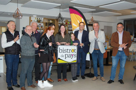 Les élus ont tout à tour salué cette belle réussite, saluant l’engagement de Coralie et Sébastien. Puis est venu, le moment émouvant de la remise de l’enseigne « Bistrot de Pays » qui se balancera très prochainement sur la façade du restaurant « Le Géorand ». Coralie et Sébastien étaient heureux de convier l’ensemble des personnes présentes à un apéritif dînatoire ... Ils sont parfaitement volontaires pour poursuivre l’aventure.